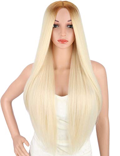Kalyss 71,1 cm ombre biondo platino Brown Root parrucche per le donne lungo rettilineo resistente al calore Premium sintetico Hari ricambio parrucche, dall' aspetto naturale divisione centrale