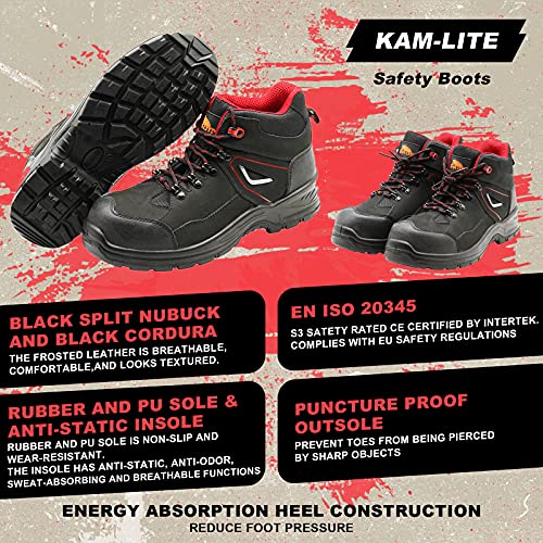 KAM-LITE - Scarponi da lavoro impermeabili da uomo, con punta in acciaio e punta in pelle, Nero (Nero ), 46 EU