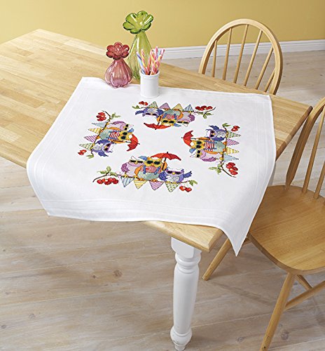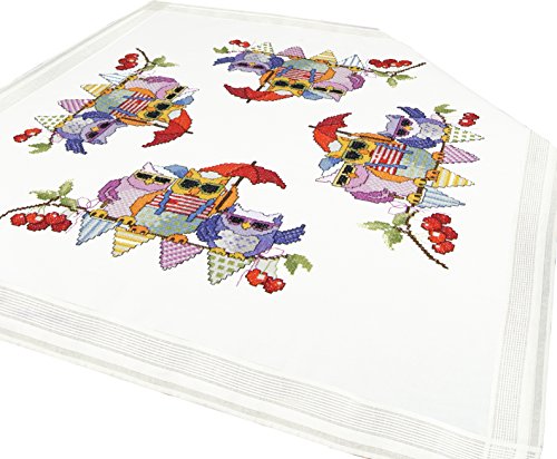 Kamaca Graziosa tovaglia da ricamare a tema gufi, 80 cm x 80 cm, modello a punto croce, realizzata in puro cotone, orlata, di alta qualità, per cucito manuale