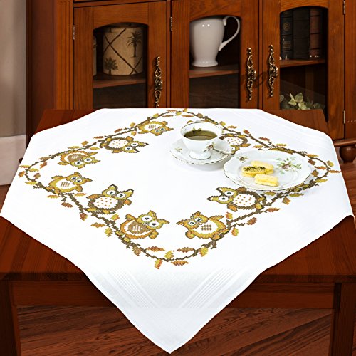 Set per ricamo a punto croce, motivo: gufi, 80 x 80 cm, in 100% cotone, già cucito con bordo decorativo intessuto, di alta qualità