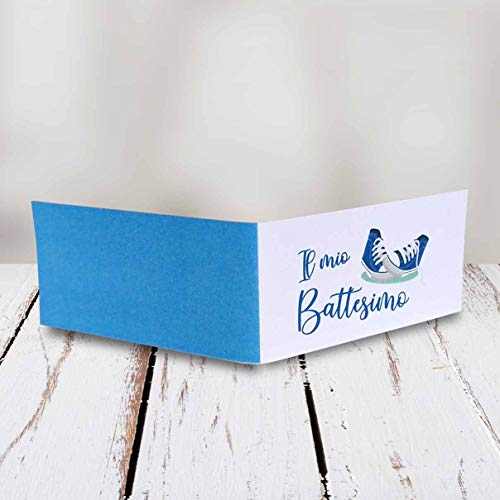 Kamiustore Bigliettini Battesimo Bimbo/Bimba neutri MOD. Sneakers - Set da 20-50-100 Pezzi (100 bigliettini, Azzurro)