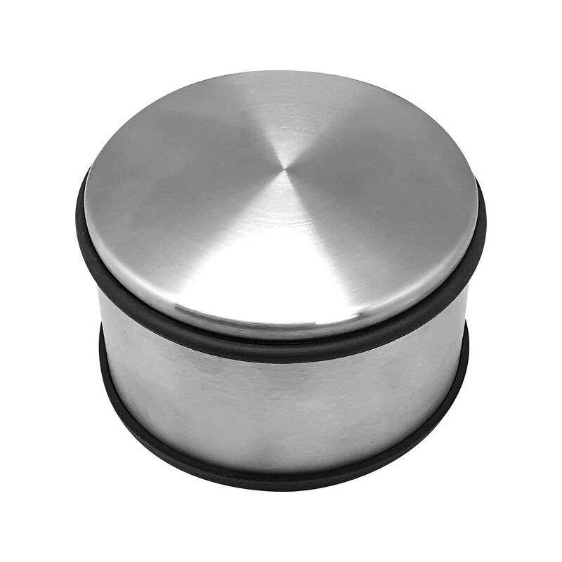 Fermaporta cromato, modello alto, dotato di anello in gomma per proteggere la porta, utilizzabile ovunque grazie al suo peso elevato e al design antiscivolo, peso 1800 grammi, diametro 11 cm, altezza 7 cm.
