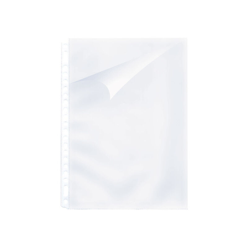 Busta da esposizione di qualità standard in PP 80 mμ, adatta per il formato A4, design liscio, resistente alla copia. Il lato superiore e sinistro sono aperti e i fori perforati sono rinforzati con una striscia bianca. 23 buche.