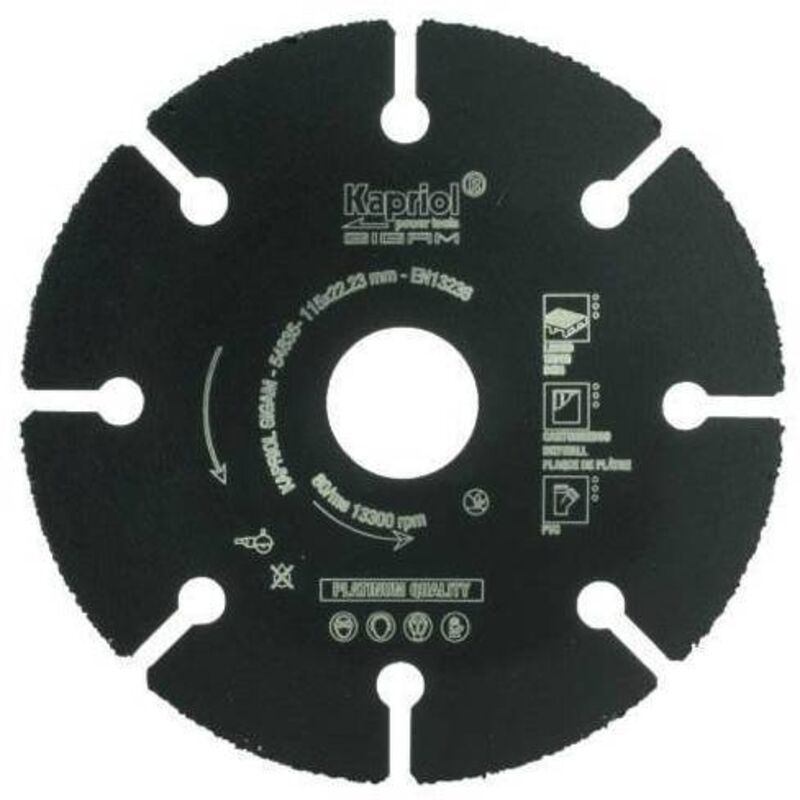 Mod. 54835 disco extra sottile al carburo di tugsteno. Speciale anima in acciaio con asole di scarico. Ideale per il taglio di legno da costruzione, compensato, truciolato, materiali in fibra (MDF) laminato, parquet, epossidico, fibra di vetro, PVC e cartongesso. Foro 22,2 mm. Diametro 115 mm.