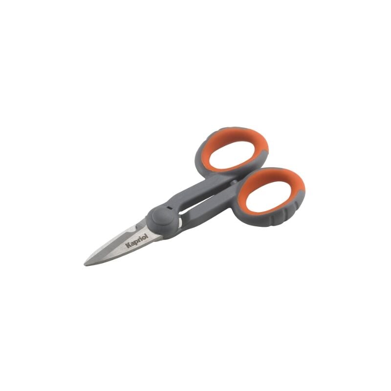 Forbici in acciaio inox, con impugnatura ergonomica e confortevole in materiale bicomponente. lama seghettata per migliore tenuta dei materiali e tacca spelafili