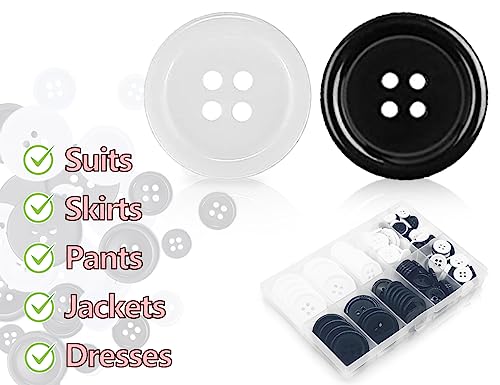KAPSING 160 pezzi set di bottoni bianchi e neri, 4 fori in plastica rotonda, bottoni per camicia in plastica, bottoni per cucito in resina con scatole di immagazzinaggio(10/12,5/15/20/25mm)