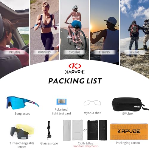 【4 Lenti intercambiabili】KAPVOE cycling Glasses dotato di 4 lenti intercambiabili con protezione UV ma solo la lente nera è polarizzata. Ripristinare il vero colore eliminare la luce riflessa e la luce diffusa. Lenti HD Clear adatte per nuvoloso In ambienti con poca luce la visione è chiara. Le lenti gialle sono adatte alla notte e agli ambienti scuri migliorando la luce.