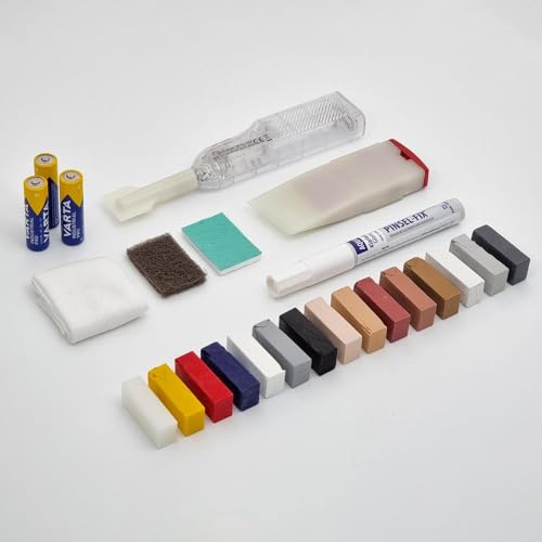 COMPRESO NEL KIT: Il nostro kit per il ritocco delle piastrelle include 15 stick colorati, stucco di riempimento, piccolo panno per levigare e lucidare, fusore, panno di cotone, penna sigillante, cera lucidante e istruzioni