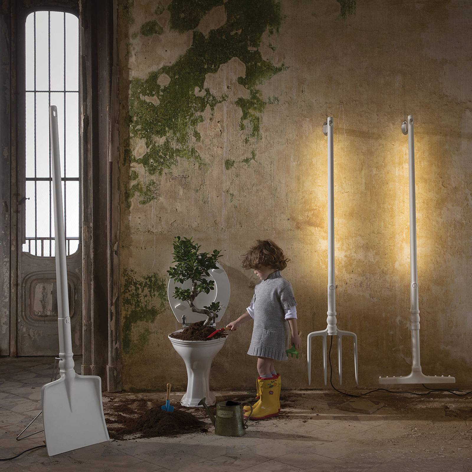 Utensile da giardino sotto forma di lampada: Lampada da terra LED Tobia come rastrello Ogni giardiniere dilettante è consapevole che un rastrello non deve stare nel salotto, ma che deve essere depositato nella rimessa per attrezzi. Il fatto che ora nel salotto ci sia anche un rastrello lo si deve al designer Matteo Ugolini, che ha progettato per il produttore di lampade italiano una lampada da terra che assomiglia incredibilmente a un rastrello. L'unica differenza consiste nel fatto che il rastrello a lampada è realizzato in tecnopolimero e non lascia tracce di sporco nella casa. Inoltre, in quanto lampada, naturalmente è dotata di fonti di luce, ovvero LED, nella parte posteriore. La lampada da terra a LED Tobia può essere appoggiata comodamente alla parete oppure, con l'ausilio di un gancio o di un piede (entrambi non compresi nel volume di fornitura) appesa al muro o installata in mezzo alla stanza. Karman è un'azienda di lampade con sede a Fossombrone nell'Italia centrale. Qui si svolge anche la produzione che si avvale della tradizione dell'artigianato artistico italiano e garantisce quindi che vi siano sempre anche fasi di lavoro manuali.