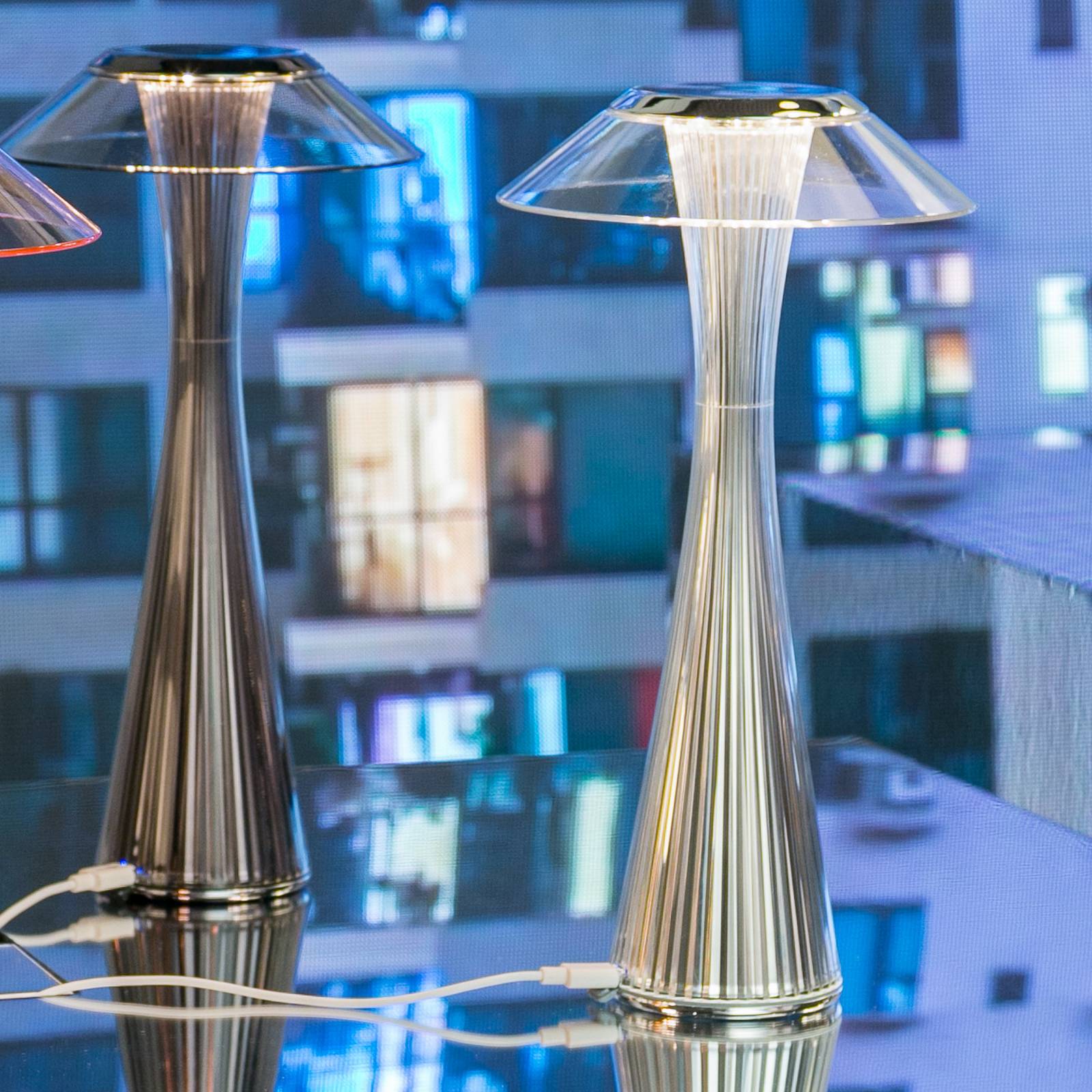 Lampada LED da tavolo ricaricabile Space di Adam Tihany Quando ha ideato la lampada LED da tavolo Space, il designer Adam Tihany aveva in mente il famoso Seattle Space Needle, la torre panoramica costruita per la Expo del 1962. Anche l'aspetto di questa lampada è futuristico, si potrebbe dire quasi spaziale. Space è una lampada con accumulatore ricaricabile che tiene la luce accesa per un massimo di otto ore. Sia il corpo della lampada che il paralume sono di varie plastiche (PMMA e ABS), in parte trasparenti e in parte opache. La luce si accende e spegne semplicemente sfiorando la parte superiore del paralume. La plastica in tutte le sue forme e colori è il materiale che compone oggetti di design con cui la Kartell è diventata famosa nel corso degli ultimi decenni. Alcune delle creazioni Kartell sono ormai diventate veri classici del design. Tra gli oggetti più famosi figurano ad esempio la seggiolina K 1340, lo spremiagrumi KS 1481 oppure