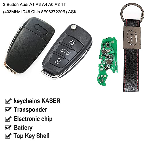 KASER Chiave Telecomando Elettronica 3 Tasti Compatibile per Audi A1 A3 A4 A6 A8 TT (433MHz ID48 Chip 8E0837220R) ASK Scheda Transponder con Portachiavi