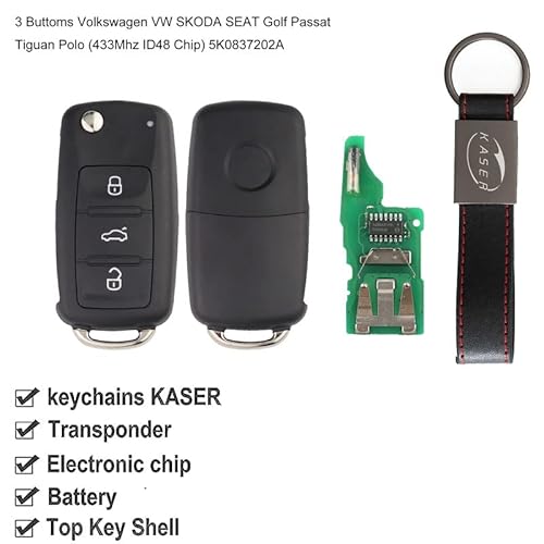 KASER Chiave Telecomando con Scheda Elettronica 3 Tasti per Volkswagen VW SKODA SEAT Golf Passat Tiguan Polo (433Mhz ID48 Chip) 5K0837202A Transponder con Portachiavi