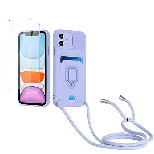 Kaslly Cover Compatibile con iPhone 11+[2 Vetro Temperato],Slot Schede,360°Magnetica Anello,Protezione Fotocamera,Cordino Collana Necklace Silicone Case-Viola