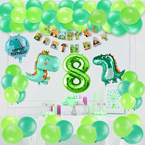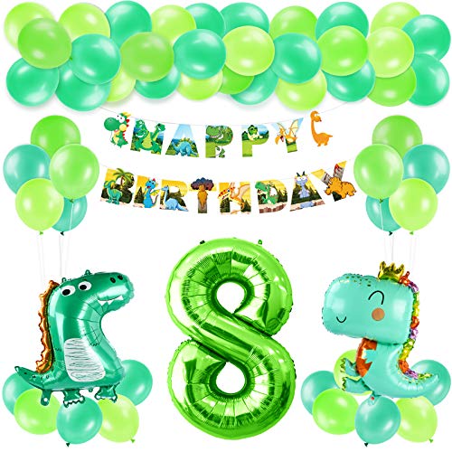 Decorazione di compleanno di dinosauro: 1 pezzo di striscione "HAPPY BIRTHDAY", 2 palloncini foil di dinosauro, 8 palloncini verde scuro, 8 palloncini verde chiaro, 8 palloncini in lattice verde frutta, palloncini numerici 1 * 40 pollici, 1 palloncino dinosauro rotondo.