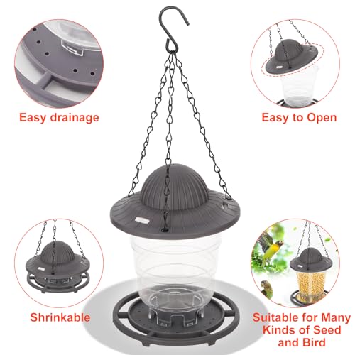 【coperchio della 】mangiatoia appesa può essere aperto in modo da poterla riempire di cibo mentre è appesa. Il design trasparente consente di vedere facilmente quando i semi si stanno esaurendo e di riempirli in tempo;