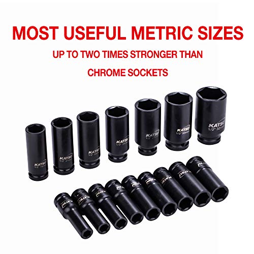 KATSU 1/2" Set di Chiavi a Bussola Profonda 16 Pezzi, 10mm-32mm Heavy Duty Metrico Chiave, Acciaio al Cromo-Molibdeno di Qualità, Strumento di Riparazione Motori Camion e Trattori 420441