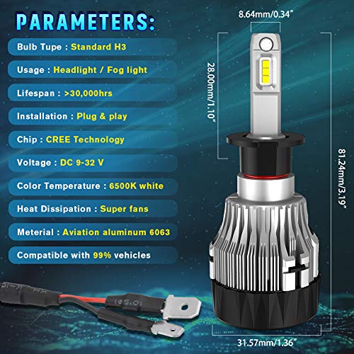 ★ 【H3 Lampadine per fari a led】 (confezione da 2) Temperatura di colore: 6500 K Xenon White. Funzionamento a 60 W (30 W per lampadina). Tensione di funzionamento: DC 9-32 V (adatto per veicoli 12V, 24 V). Uscita 10000 lumen (5000 Lms per lampadina ), molto più della lampada alogena e della lampada HID.