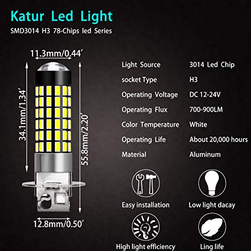 Katur, 2 lampadine LED da 900 lumen, attacco H3, super luminose3014, 78 SMD, luci per guida diurna, luci allo xeno, bianche, 6000 K, CC da 12 V a 24 V