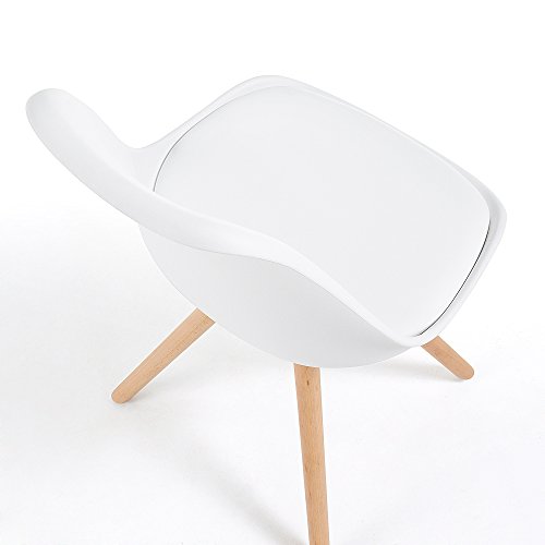 Sedia in polipropilene bianco con gambe treppiedi in legno di faggio naturale verniciato.