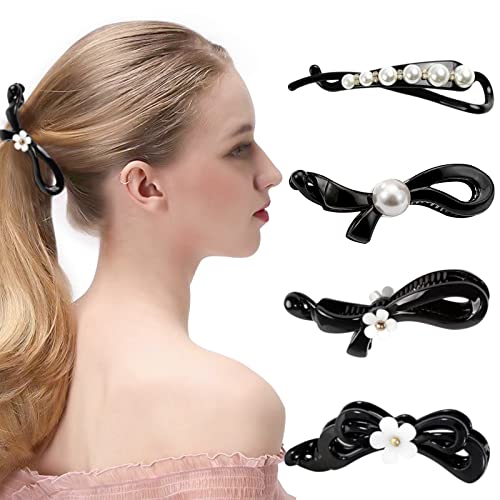 Kavya Fermaglio Capelli Donna, 4 Pezzi Banana Clip Capelli Perla Fiori Fermagli Capelli Eleganti Antiscivolo Coda di Cavallo Accessori per Capelli(Nero)