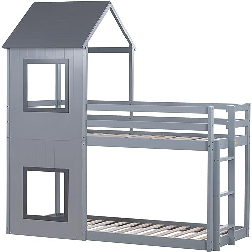 KecDuey Lettino a castello, letto per bambini 90 x 200 cm, con scala e baldacchino (grigio)