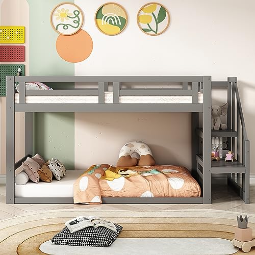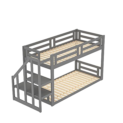 KecDuey Lettino 90 x 200 cm, letto a castello basso con scala di sicurezza, recinzione, struttura per letto a castello in legno massello con rete a doghe (grigio), LDB00042 ETAGENBETT