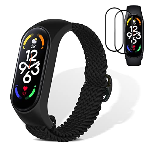 KeeFos [3 Pezzi Cinturino Intrecciato Compatibile con Xiaomi Mi Band 7/Xiaomi Smart Band 7, 2 Pellicole Protettive, Regolabile Intrecciato Sportivo Ricambio Bracciale per Xiaomi Mi Band 7 -Nero