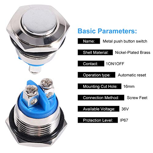 【Tipo di interruttore】: Interruttore a pulsante in metallo impermeabile antipolvere.Foro tagliato di montaggio: 16mm.Tipo di operazione: interruttore momentaneo (ritorno automatico).Tipo momentaneo: Push & Hold - ON, Release - OFF.Contatto: 1 NO (normalmente aperto).Collegamento: 2 morsetti a vite