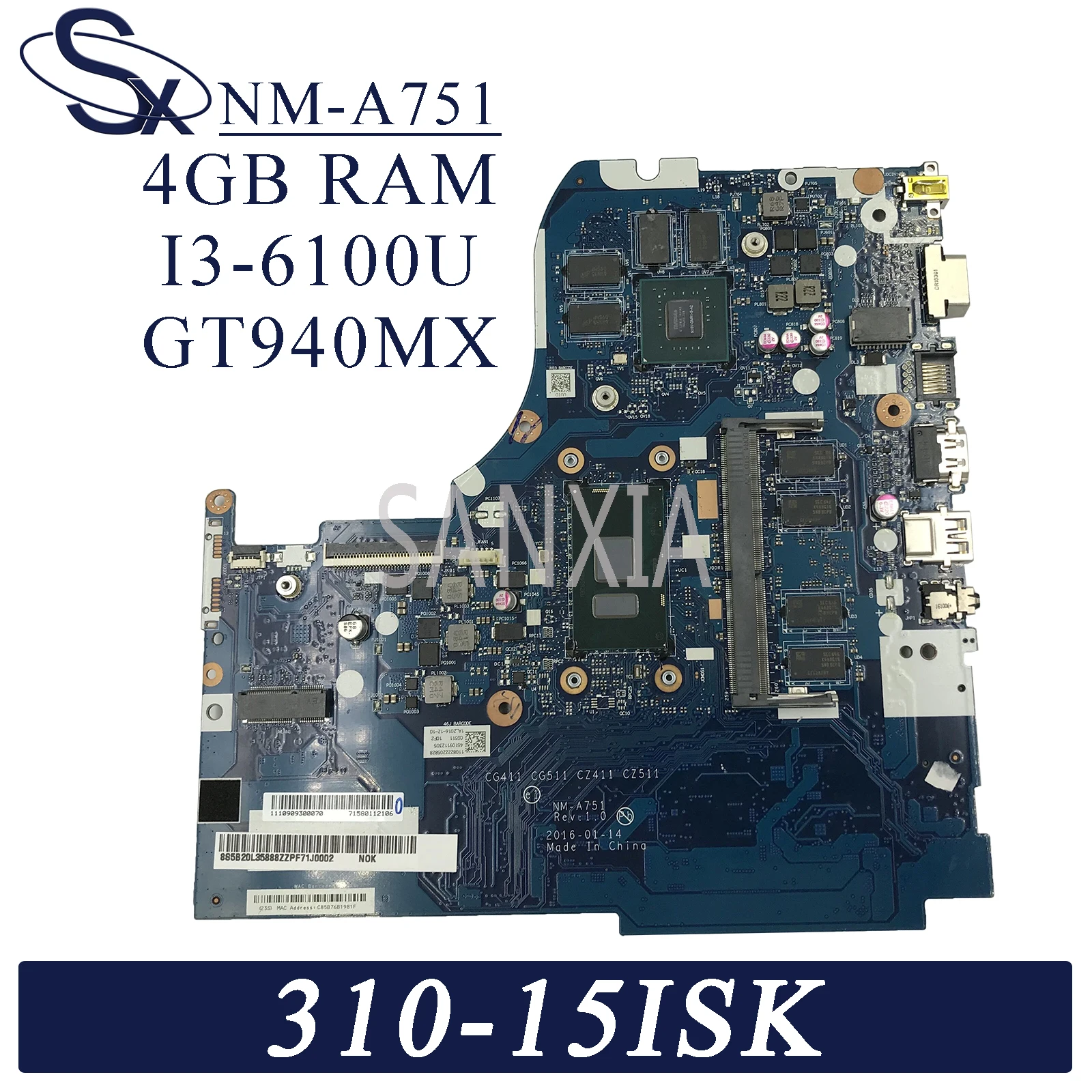 KEFU NM-A751 Laptop motherboard for Lenovo 310-15ISK 510-15ISK original mainboard 4GB-RAM I3-6100U GT940MX-2GB