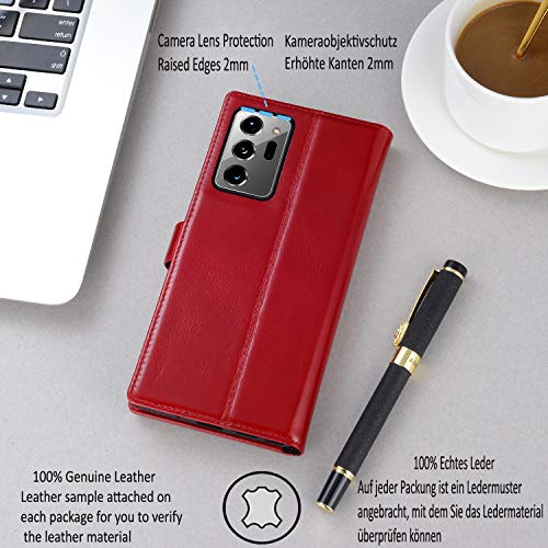 Keledes Cover Galaxy Note 20 Ultra, Custodia Libro in Vera Pelle Magnetica Protettiva Cover con con Slot Schede Funzione Supporto Blocco RFID Antiurto per Samsung Galaxy Note 20 Ultra, Rosso