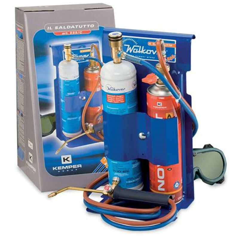 Il Saldatutto": kit composto da riduttori di pressione, valvole antiritorno, tubi da 1,5 m, cannello con due punte, occhiali, struttura, bombola di ossigeno a perdere art. 571 (100 bar), bombola di Novacet a perdere art. 580