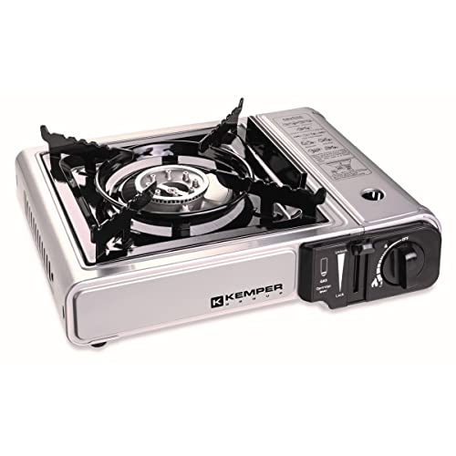 Stufa Nomade KEMPER tutto Acciaio 2200W con accensione Piezo integrata. Scomparto sicuro anti surriscaldamento. Regolatore di pressione, nuovo dispositivo di alimentazione del gas con doppio sistema di sicurezza. Potenza regolabile. Consumo: 160 gr/ora. Confezione composta da fornello + 8 cartucce di gas a baionetta butano standard. Valigetta per il trasporto. Peso: 1,6 kg.