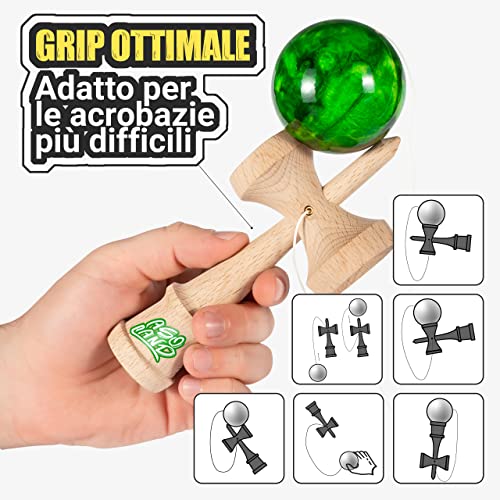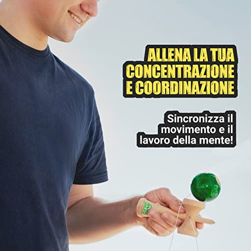 Kendama - Gioco in Legno Tradizionale - Giocattolo Giapponese per Bambini e Adulti - Migliora i Riflessi e la Destrezza - Kit Completo per Professionisti e Principianti (Verde Marmorizzato)
