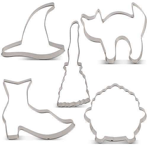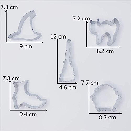 Keniao - Set di stampi per biscotti di Halloween, 5 pezzi: cappello da strega, scarpe da strega, scopa, calderone e stampini a forma di gatto spaventato, in acciaio inox