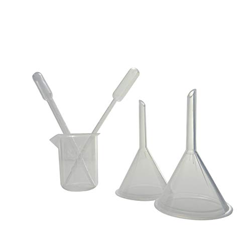 INCLUDE - Set di 25 flaconi contagocce, una bottiglia graduata in polietilene due imbuti, 2 pipette Pasteur