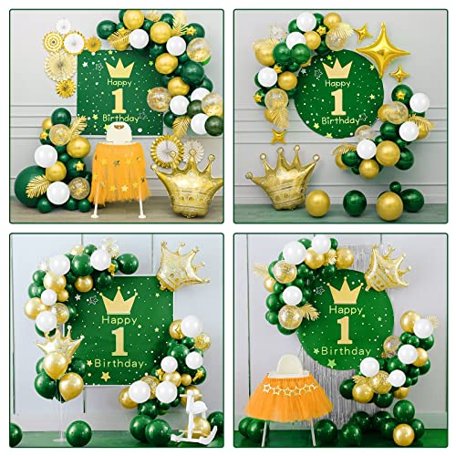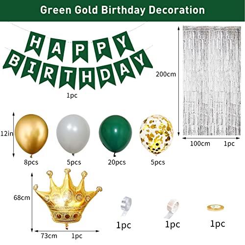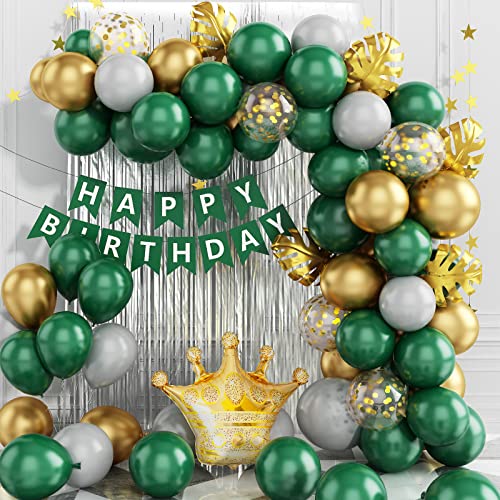 Kit di decorazioni per festa di compleanno verde e oro: riceverete palloncini verdi da 12 pollici, oro metallizzato, 8 grigio, 5 coriandoli dorati, 5 palloncini in lamina d'oro da 68 x 73 cm, 1 striscione di buon compleanno verde, foglie di palma dorate, 3 tende in lamina argentata, 1 confezione da 1 festone con palloncini strisce di atterraggio. Palloncini adesivi per palloncini;