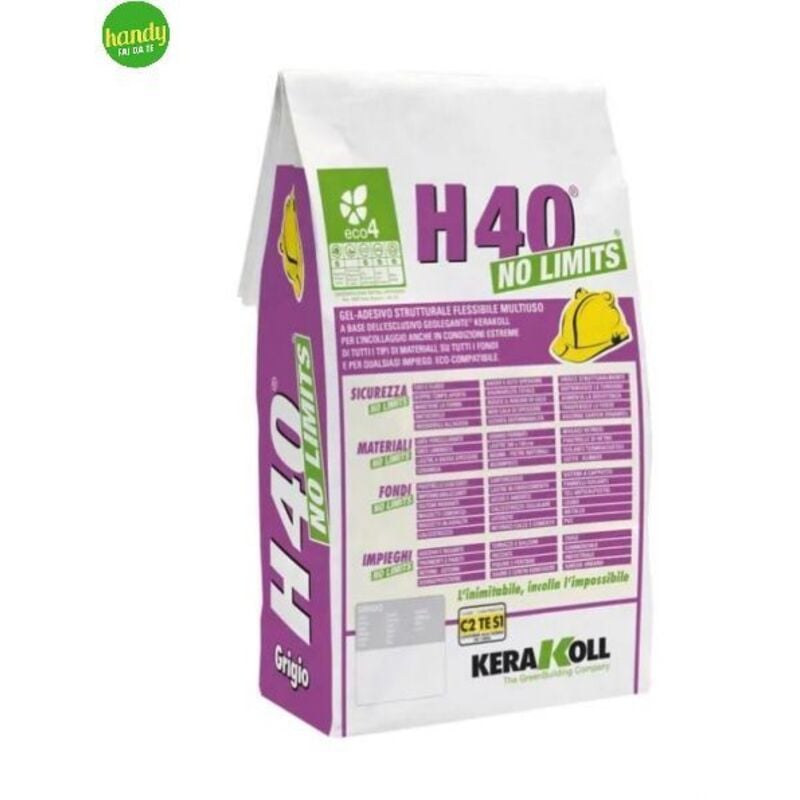 Gel-adesivo multiuso H40 no limits gel-adesivo multiuso grigio kg 5 Gel-adesivo strutturale flessibile multiuso abase dell'esclusivo geolegante kerakoll perl'incollaggio anche in condizioni estreme di tuttii tipi di materiali, su tutti i fondi e per qualsiasiimpiego.1. tixo e fluido2. doppio tempo aperto3. mantiene la forma4. antiscivolo5. insensibile all'acqua6. basso e alto spessore7. bagnabilità totale8. riduce il rischio di gelo9. non cala di spessore10.unisce strutturalmente.