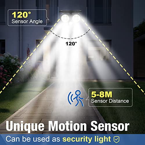 [Sensore di movimento e accensione automatica] - Questa luce solare con sensore di movimento è dotata di un sensore di movimento PIR altamente sensibile che rileva i movimenti in un'ampia gamma di 5-8 me 120°. Passa alla modalità luce fissa per disattivare la funzione del sensore di movimento. Dopo una carica completa, la lampada fornisce 6-8 ore di luce continua.