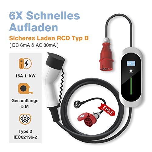 Keruida EV Caricatore Tipo 2 16A 11kW, 5 Metri Caricabatteria Portatile per Auto Elettrica Spina CEE e Adattatore Schuko Caricatore Cavo di Ricarica EVSE Commutabile 8A-16A