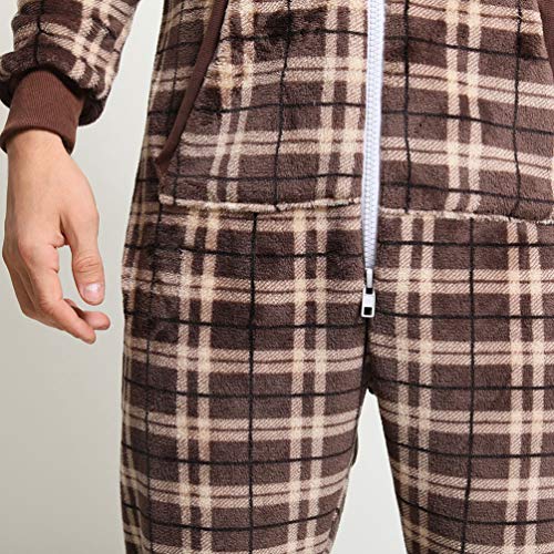 Ketamyy Uomo Pigiama con Cappuccio Casual Double Zip Manica Lunga Flanella Quadri Adulti Pezzo Unico Pajamas Primavera Invernale Autunno Confortevole Caldo Pigiami da Casa Marrone M