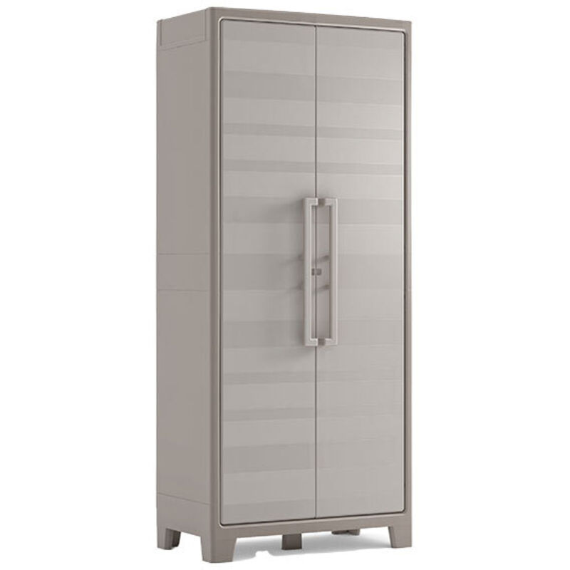 Armadio alto a doppia anta in resina, spazioso e impermeabile, ottima soluzione per organizzare il tuo terrazzo, il tuo giardino e il tuo patio. Certificazione IPX3 per utilizzo all'aria aperta, infatti non scolorisce perché resistente agli agenti atmosferici. Dotato di 8 ripiani regolabili con capacità di carico di 30 kg l'uno, piedini regolabili e predisposizione per lucchetto (lucchetto non incluso) per una maggiore sicurezza. Prodotto con materiali riciclabili, richiede poca manutenzione ed è facile da pulire. Caratteristiche Tecniche: Dimensioni (LxPxH) 80x44x182 cm Colore: sabbia/beige Lucchettabile (lucchetto non incluso) Dimensione confezione (LxPxH) 32,4x84,8x47,5 cm - Peso: 17 kg Tutti i prodotti all'interno dell'armadio e all'esterno presenti in foto non sono in vendita. Abbinabile alla versione tutto piani e a quella bassa.
