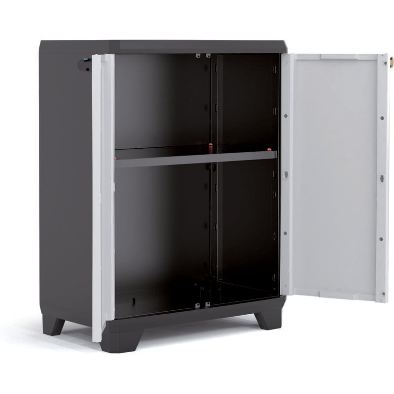 Keter armadio basso linear cm. 68x39x90 h col. grigio/nero In resina, 1 ripiano regolabile in altezza, portata max per ripiano kg. 15, piedini regolabili, maniglia soft-touch, lucchettabile. Articolo produttore: 9725000 0616 13