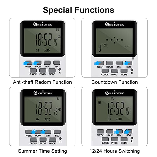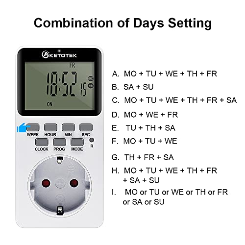 KETOTEK Presa Temporizzata Timer Digitale Programmabile Spina Timer Elettronico Display LCD 20 Gruppi on/off 16A 3600W Temporizzatore Presa Elettrica 24 ore 7 Giorni Risparmio di energia AC220V