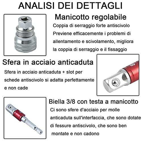 Dimensioni universali: le bussola universali possono essere adattate a qualsiasi dimensione o forma per viti standard da 3/8 a 3/4 di pollice e metriche da 10 mm a 19 mm, dadi e bulloni e altri oggetti di tutte le forme e dimensioni con una coppia di serraggio fino a 430 Nm.