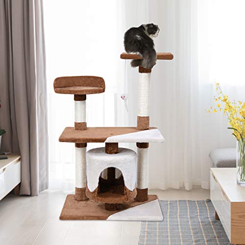Sono un grosso gatto grasso e ho vissuto sul mio albero di gatto multistrato per un po '. Queste torri per gatti sono dotate di ampio condominio e tre piattaforme. Il mouse e le piattaforme di varie altezze mi permettono di saltare, grattare, riposare e giocare.