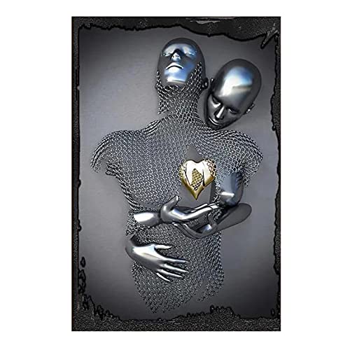 KHADR Tela Astratta Coppia 3D Effetto Wall Art, Love Heart Figure Scultura in Metallo Poster, Grigio/Oro-Art Wall-Regalo di San Valentino, Artwork Hotel Home Bagno Decor,60x90cm Senza Cornice