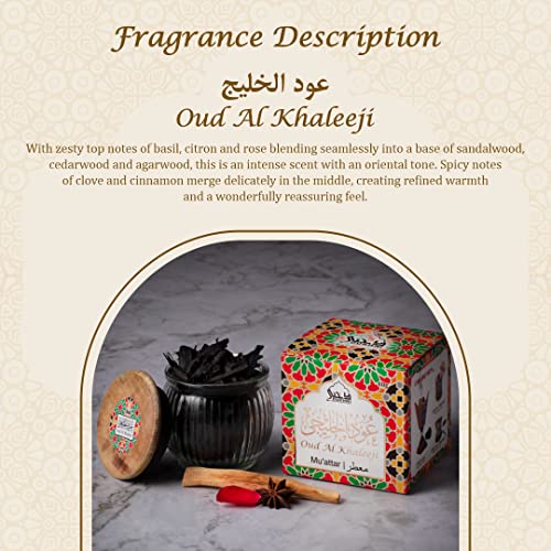 Contenuto: Questo include 1 barattolo di Oud Al Khaleeji Muattar Bakhoor. Il barattolo contiene 40 grammi di incenso Muattar Bakhoor.