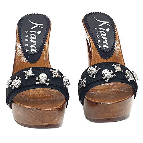Kiara Shoes Zoccoli da Donna con Fascia Nera e Teschietti Argento - 35 al 41 - KH12-NERO (39 EU, Nero)