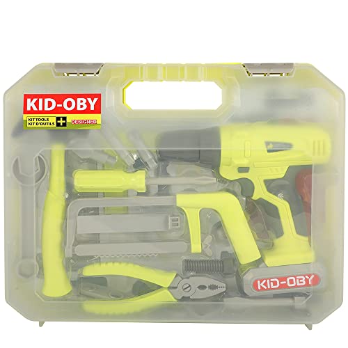 ⭐ Una valigia utensile completo Kid-Oby da 37 pezzi, con un trapano avvitatore elettrico a doppia direzione a batteria, una sega, un cacciavite, una pinza, viti e dadi... Un giocattolo d'imitazione per bambini dai 36 mesi in su.