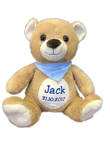 KIDDI-MEDIA Orsacchiotto con Nome e data di Nascita Ricamato/Regalo per Battesimo Nascita/Personalizzato / 30 cm (fular Blu per Maschietto)